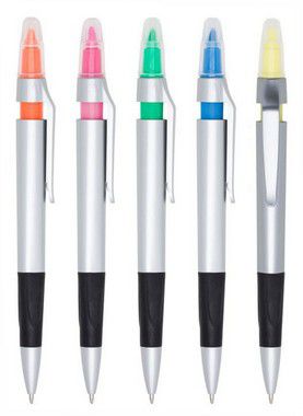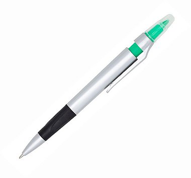 Descrição: Caneta plástica esferográfica e marca texto com corpo prata. Possui tampa protetora no marca texto
